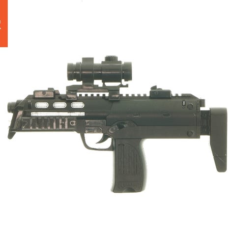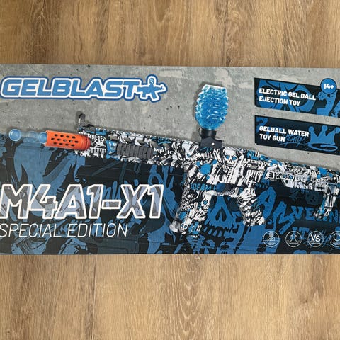 Gel blaster legetøjspistol i hvid og grøn plast. Pistolen har integreret magasin til Gel-kugler på oversiden samt aftagelig gennemsigtig beholder. Bruger batteri.