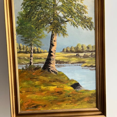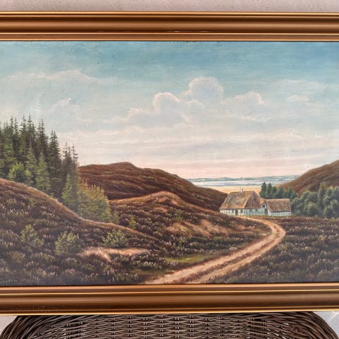Landskabsmaleri på lærred signeret HR 1953 i nederste højre hjørne og på bagsiden anført: “Parti af Gjørsløv 1916”. Måske nutidens Gørslev ? Motivet viser en landsby med kirke, gårde, høstak og en dam med gæs i forgrunden. Maleriet er monteret i en profileret guldfarvet ramme med rammemål 83x54. Bagsiden viser lærred opspændt på træramme med ophængssnor.