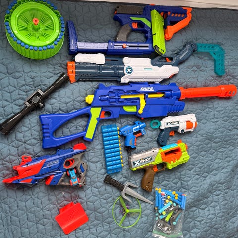 Nerf legetøjsblaster sæt med mange pile. Sættet består af flere Nerf-blastere i forskellige størrelser samt en beholder med løse skumdart pile. Egnet som legetøj til børn, til leg og målskydning med skumpile.