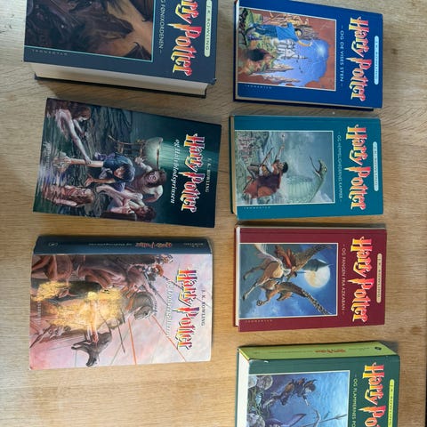 Harry Potter Hardback og paperbacks Gyldendals 2. udgave med Per Jørgensens prisbelønnede forside illustrationer. Af J. K. Rowling. Udgået fra forlaget.