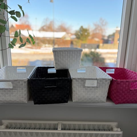 IKEA flettede opbevaringskurve i brun naturfarve. Kurvene er rektangulære med integrerede håndtag i siderne, som gør dem nemme at løfte og flytte. De egner sig til opbevaring i køkken, bryggers, garderobe eller på reoler, hvor de kan bruges til fx service, tekstiler eller andre mindre genstande. Materialet er flettet naturmateriale, som giver et ensartet udtryk på alle kurvene.