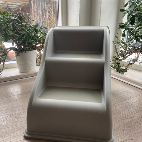 Trappe til kæledyr i gråt stof med tre trin. Velegnet til at hjælpe mindre hunde eller katte op i sofa, seng eller andre forhøjede overflader. Blød polstring og betræk giver et behageligt underlag for dyrets poter. Stabil konstruktion, egnet til indendørs brug.