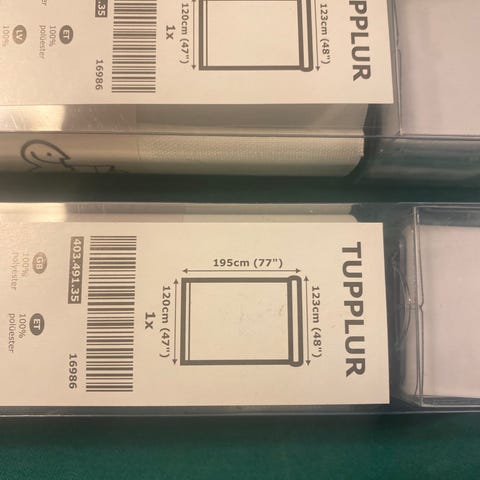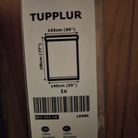 IKEA Tupplur rullegardin med mørklægning. Gardinet måler 195 cm i længden og 180 cm i bredden. Fremstillet i 100 % polyester. Leveres som rullegardin på rør, klar til montering efter medfølgende anvisning. Velegnet til vinduer, hvor der ønskes effektiv afskærmning af lys. Hænge mekanisme er ikke med, kan evt købes i IKEA. Kun gardinet ingen beslag!!!!