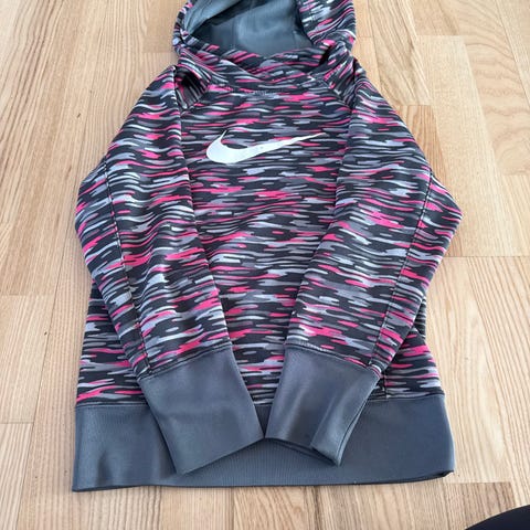 Den populære Nike pige jakke i str. 116 - 122. Jakken er lyserød med sort fleecefor indvendigt og hætte.