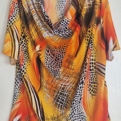 Blusen har et underlag i glat stof i 95 % polyester og 5 % spandex, og et lag ovenpå i gennemsigtigt blondelignende materiale med blomstermønster af 80 % bomuld og 20 % polyester. Overdelen har en løs pasform med kort ærmeeffekt fra det yderste lag og en dekorativ metalring ved halsudskæringen. Velegnet som pæn overdel til bukser eller nederdel.