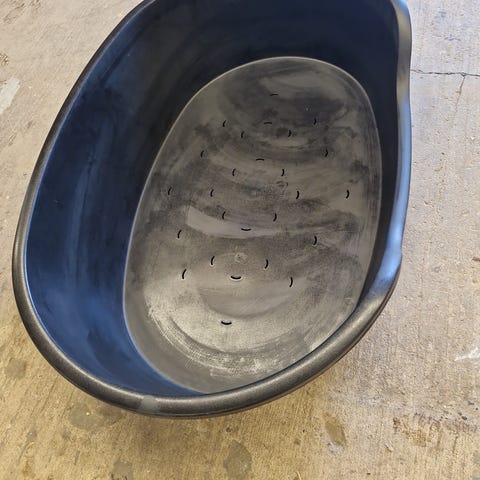 Plast hundekurv i grå farve. Oval form med ventilationshuller i bunden samt små fødder under bunden, der løfter kurven let fra gulvet. 60 x 36 cm.
