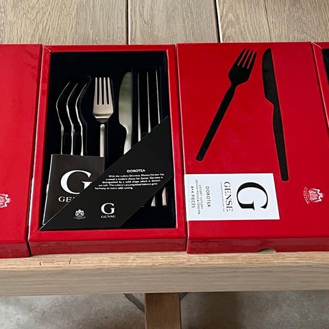 Georg Jensen Bernadotte 24 dele bestiksæt i rustfrit stål. Sættet har det karakteristiske riflede Bernadotte-design med kniv, gaffel, spiseske og teske vist på æsken. Velegnet som dagligt bestik eller til opdækning ved særlige lejligheder. Klassisk, tidløst design i stål, der passer til mange typer stel og borddækning.
