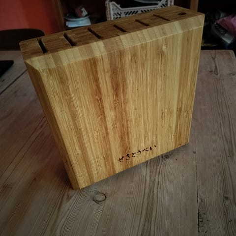 Hej! jeg sælger denne lækre japanske knivnblok fra mærket MIYABI. Den er i lavet i tykt bambus og fugnerer som display og holder for køkkenknive på køkkenborden, hylder eller andet.