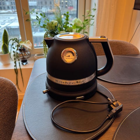 KitchenAid elkedel i sort med ståldetaljer. Elkedlen har indbygget termometer i fronten og kan indstilles i ønsket temperatur. og aftagelig 360° base med ledningsoprul. Indersiden er i rustfrit stål med aftageligt filter ved tud.