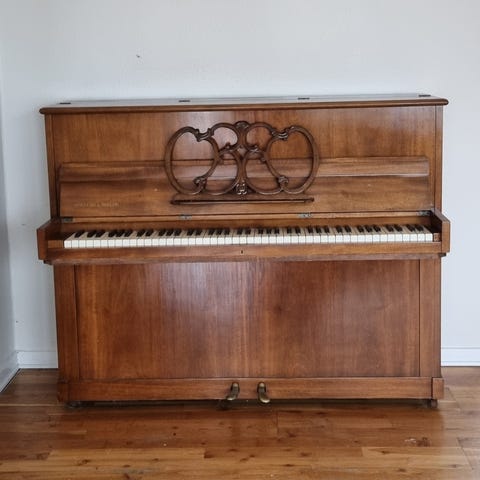 Hartenberg & Co opretstående klaver i træ. Klaveret har fuldt klaviatur med hvide og sorte tangenter samt to pedaler. Kabinettet er udført i træ med klassisk paneldesign på fronten. Egnet til brug i hjemmet, øvelokale eller lignende, hvor der er behov for et akustisk opretstående klaver.