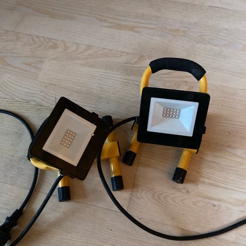 Sartano arbejdslampe med teleskopstander og to lampehoveder. Lampen har en samlet effekt på maks. 2 x 400W og anvender R7S pærer. Driftsspænding er 230V, 50Hz. Lampen er monteret på gul stativ med justerbar højde, egnet til belysning af arbejdsområder, værksted eller byggeplads. Oplysninger på typeskilt: model CE-88B-Y, art.nr. HN 2276, importeret af A/S Harald Nyborg.