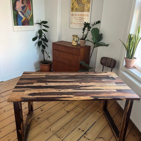 Solid wood table with metal legs. Around 165 cm long and 110 wide in the widest place.