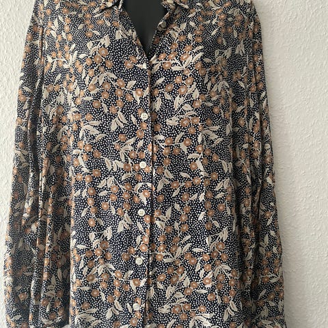 Flot skjorte med blomsterprint i brune og beige nuancer. 100% viskose – blød og behagelig at have på. Knapper hele vejen ned foran samt manchetknapper på de lange ærmer.
