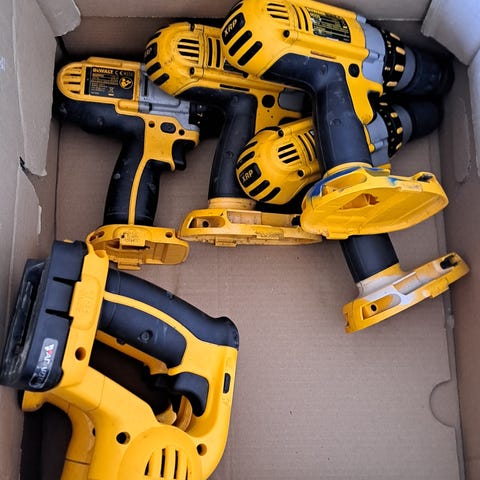 DeWalt akku vinkelmaskinei gul/sort plast og gummi. Ledningsfri model til brug med batteri (batteri og lader ikke synlige på billedet). Egnet til skæreopgaver i træ, metal eller plast afhængigt af valg af klinge. Ergonomisk greb med gummibelægning for bedre kontrol under arbejdet.