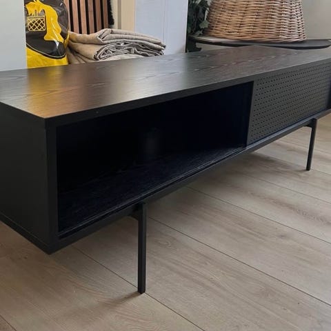 Tv-bord med skydelåger i mørk træfinish. Møblet har to skydelåger på fronten og indvendigt to rum med hylder til opbevaring af fx elektronik, kabler eller medier. Bagsiden har udskæringer til kabelføring, så ledninger kan føres diskret bag om møblet. Egnet som tv-møbel eller lavt opbevaringsmøbel i stue eller værelse. Møblet er til gratis afhentning efter først til mølle princippet.