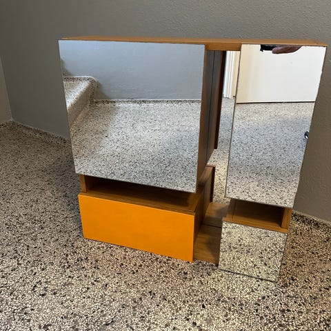 Spejlskab med dobbeltdøre og indvendige glashylder. Skabet har spejl på ydersiden af dørene og flere hylder indvendigt til opbevaring af toiletartikler eller andre småting. Velegnet til montering på væg, f.eks. på badeværelse eller i entré, hvor der er behov for både spejl og opbevaringsplads.