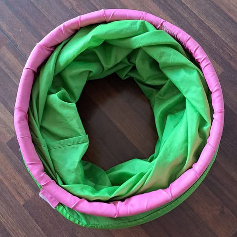 IKEA legetunnel til børn i sammenklappeligt design. Tunnelen er primært grøn med farvede kanter i pink og blå. Fremstillet i let tekstilmateriale med indvendig bøjlekonstruktion, der holder formen, når den er foldet ud. Egnet til leg på gulv indendørs og kan nemt foldes sammen for opbevaring, når den ikke er i brug.