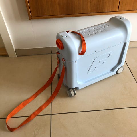 Verdens eneste kombination af en ride-on kuffert, en håndbagagekuffert og en flyseng eller benstøtte til børn.