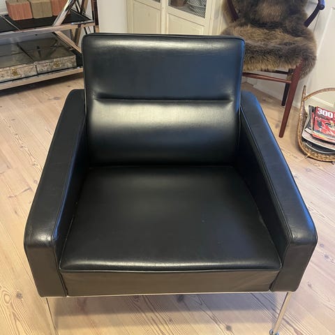 Fritz Hansen lænestol designet af Arne Jacobsen. Stolen er polstret med sort læder og har en formstøbt skal med høj ryg og integrerede armlæn. Understel i metal med drejefod. Egnet som lænestol i stue, kontor eller loungeområde.