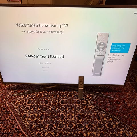 Samsung tv. Fladskærms-smart tv på 42 tommer. velegnet til brug i stue eller soveværelse. Tv’et står på to fødder og leveres med fjernbetjening, som ses på billederne. Brugt meget lidt som extra fjernsyn i sommerhus.