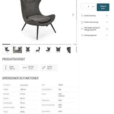 Flot lænestol i gråt stof. Den er næsten ikke brugt så fremstår rigtig pæn. Mål kan ses på billedet.