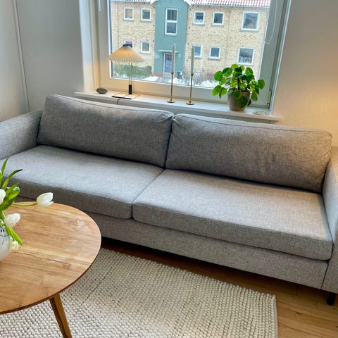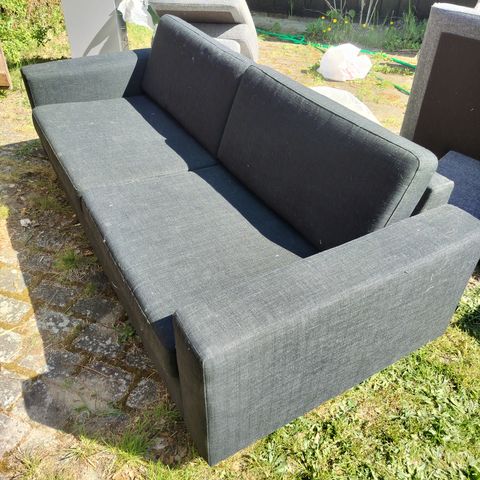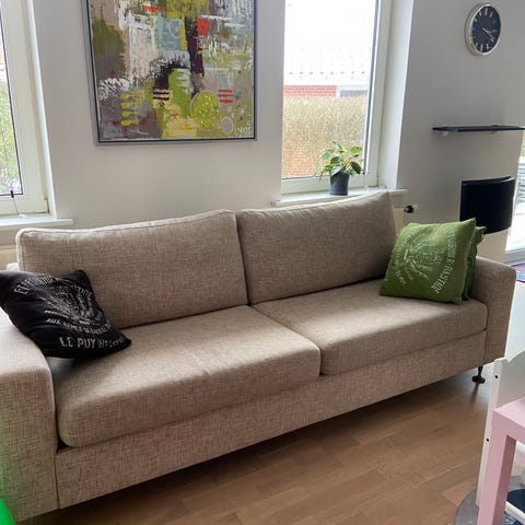 God 3-personers sofa med chaiselong fra Bolia, som vi har været glade for.