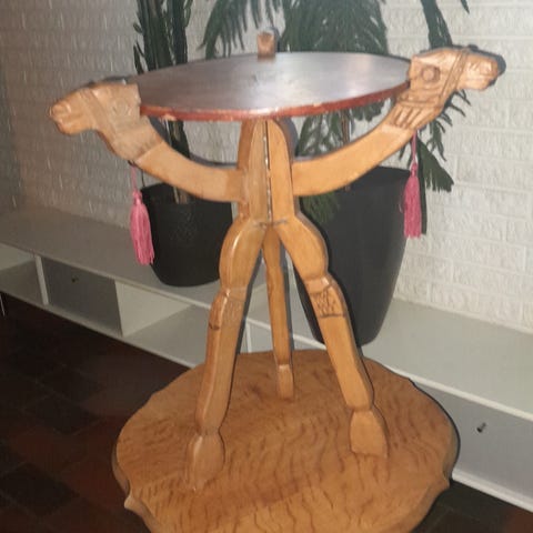 Rundt plantestativ i mørkt træ med fire buede ben og lille rund hylde nederst. Egnet som plantestativ eller lille sidebord i stue, entré eller lignende rum.
