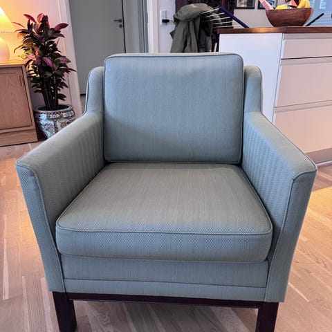 Jeg sælger denne rustrøde, flotte og klassiske lænestol, som er fantastisk at sidde i. Den mangler desværre to knapper.