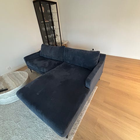 Sofa med chaiselong I blå fløjlsbeklædning med sorte metal ben. Sofaen har 3 ryglæn puder og en chaiselongsektion for ekstra sidde og liggeplads.