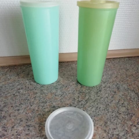 Tupperware opbevaringsbeholdere/små krus i plast. 2 små har tilhørende låg.
