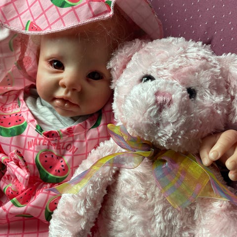 Reborn baby (kit Sophia af Ann Timmerman)• Ca. 54 cm lang• Vægt ca. 2765 g – realistisk tyngde• Chokoladebrunt mohair/babyhår• Brune glasøjne• Lavet af Bente Kofoed