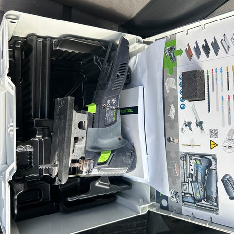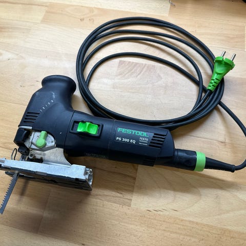 Festool PS 300 EQ stiksav. Ledningsført model egnet til præcisionssavning i træ og andre egnede materialer. Leveres i kuffert med tilhørende ledning og tilbehør som vist på billedet. Velegnet til både gør-det-selv-opgaver og professionelt brug, hvor der er behov for nøjagtige kurve- og lige snit.
