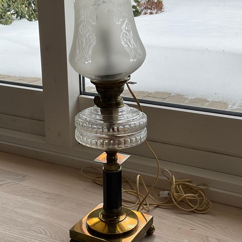Antik petroleumslampe ombygget til el. Loftslampe i messing med hvid glasskærm. Lampen er udført med kædeophæng og dekorative messingdetaljer. Den hvide glasskærm giver et blødt og diffust lys, velegnet til belysning fx over spisebord eller i stue. Lampen har klassisk design med justerbare ophængsstænger og kugledetaljer i messing.