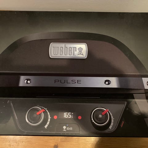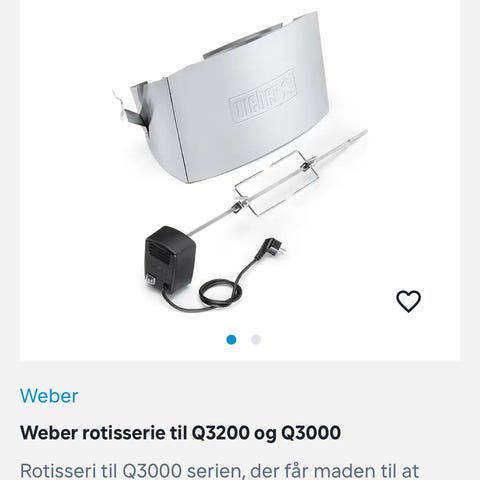 Weber elektrisk rotisserimotor til grill. Enheden er mærket som outdoor rotisserie drive motor og er beregnet til 220-240V, 50/60Hz. Motoren monteres på grillens side og driver et rotisserispyd til tilberedning af mad ved jævn rotation. Velegnet til brug på kompatible Weber-grillmodeller, hvor der ønskes elektrisk drevet rotisserifunktion.