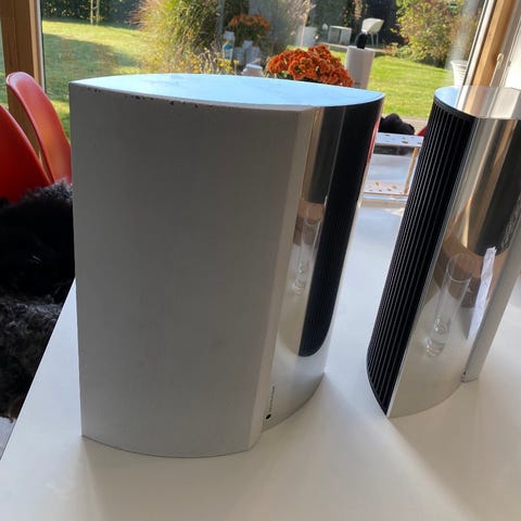 Bang & Olufsen højttalere i sølv og grå finish. Kabinettet har en kombination af blank metaloverflade og grå sidepaneler. Velegnet som stereohøjttalere i stue eller som del af et eksisterende Bang & Olufsen-lydsystem. Kan placeres på hylde eller andet plant underlag. Yderligere tekniske specifikationer som modelbetegnelse, effekt og tilslutningsmuligheder er ikke angivet.
