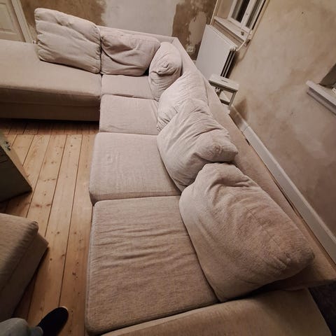 En cleveland hjørnesofa med chaiselong lidt over et år gammel funger fint hunden har lige haft fat i det en hjørne trænger til en støvsugning hent den for en liter sodavand og 2 poser blandt slik