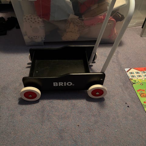BRIO gåvogn i sort med røde og hvide hjul. Klassisk model med metalbøjle/håndtag og lad til legetøj. Egnet som støtte til små børn, der øver sig i at gå, samt som legevogn til transport af bamser og andet legetøj i hjemmet.