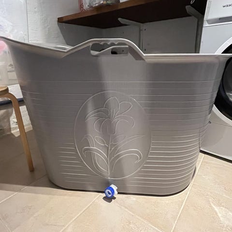 Badekar / balje i sort plast. Baljen har integreret fodindsats med markering til fødderne og forhøjet område til hælene. Udvendigt er der bærehåndtag i hver side og dekoration med blomstermotiv. Egnet til børn & voksne.