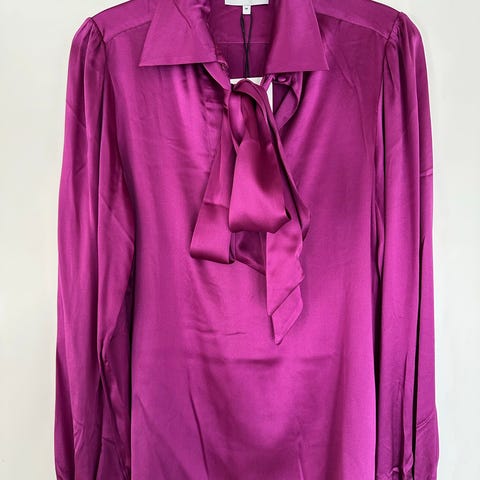 Blusen er fremstillet i et materiale, som er en slags “let krøllet” viscose.