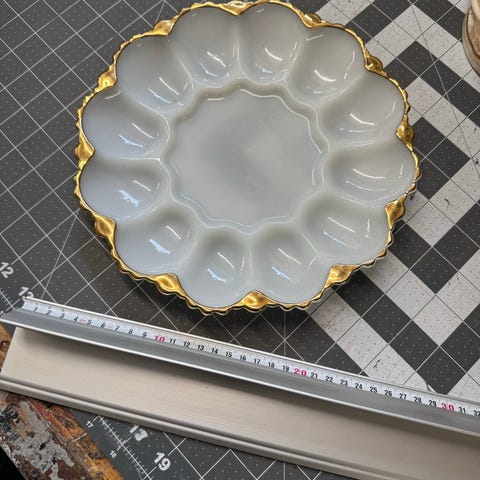 Æggefad i hvidt porcelæn med harefigur i midten. Fadet har flere runde fordybninger langs kanten, som kan bruges til at placere påskeæg eller anden lille pynt. Velegnet til servering af påskeæg, eller hvor den er pyntet med farvede æg. Har en diameter på ca. 22. cm. De farvede æg kan tilkøbes for 6 kr stykket.