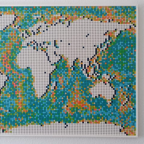 LEGO Verdenskort. Sættet består af små mosaik-lignende klodser, der samles til et verdenskort, som kan hænges op som vægdekoration. Motivet viser verdens kontinenter og oceaner i flere farver, og kortet kan arrangeres på forskellige måder. Egner sig til bygge- og kreative aktiviteter og som dekorativt element i hjemmet.