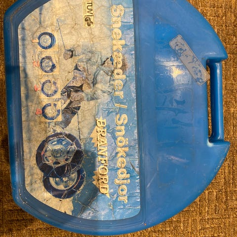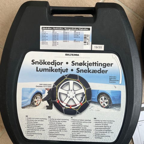 snekæder til personbil. Snekæderne leveres i plastkuffert med håndtag til opbevaring og transport. Kæderne består af stålkæder med farvede plastbøjler og strammere, der gør det lettere at montere dem på dækkene. På kassen findes en oversigt over kompatible dækmål, så kæderne kan tilpasses forskellige dækstørrelser inden brug. Velegnet til kørsel på sne- og isglatte veje, hvor ekstra vejgreb er nødvendigt.