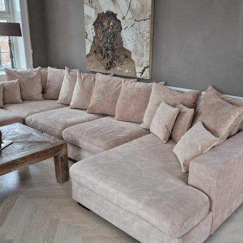 Sofa i fløjlsstil, med plads til op til 8 personer.