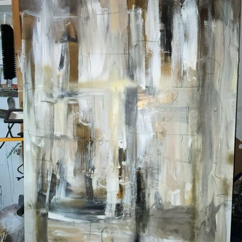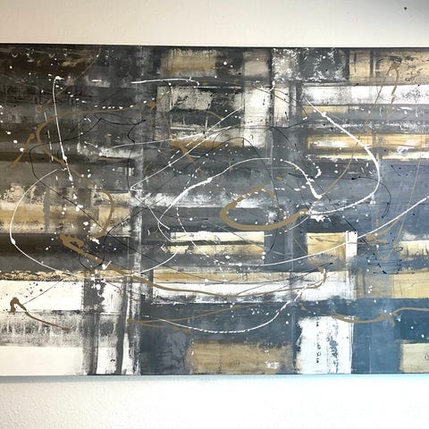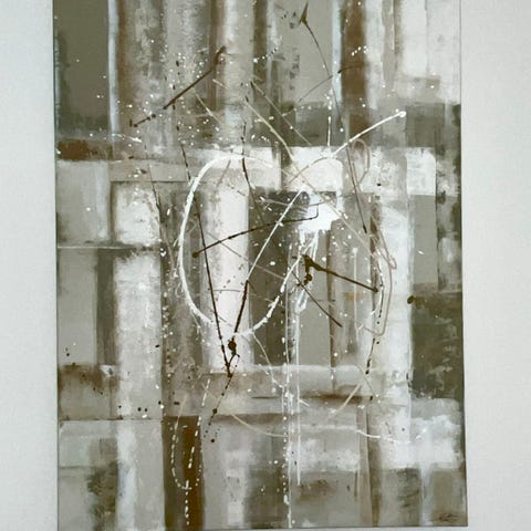 Abstrakt maleri med geometriske og organiske former i neutrale farver som grå, hvid og beige. Maleriet har et moderne udtryk med lag af farve og tekstur. Velegnet til indretning i stuer, kontorer eller andre rum, hvor et kunstnerisk element ønskes.