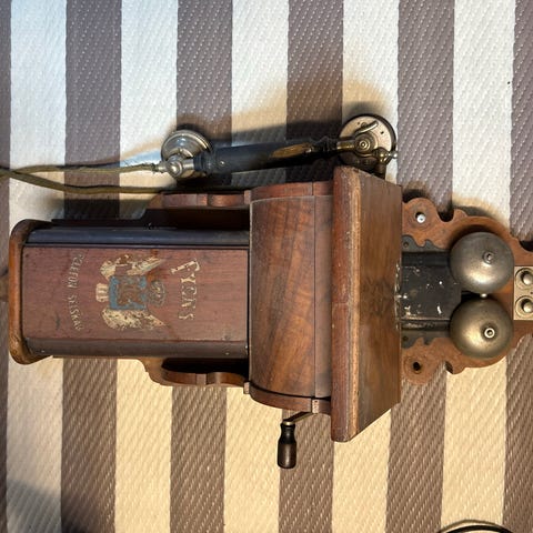 Virkelig flot antik telefon. Kabinettet er i lakeret træ med dekorativt emblem på fronten. Egnet som samlerobjekt eller som dekorativt indslag i indretningen. Mål er ca H73 B35 D2