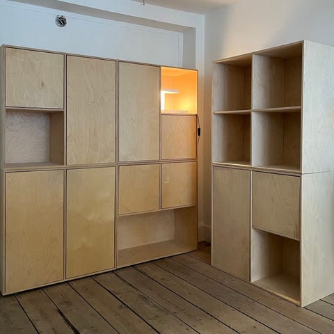 Sæt på 3 bogkasser af bøg, netop restaureret efter forsikringssag. Det ligner noget MK inspiration, dog primært på mål og rum.