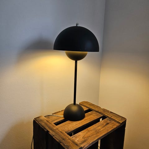 Holderen er dog blevet let bøjet, hvilket gør, at skærmen sidder en smule skævt. Det er udelukkende kosmetisk og har ingen betydning for lampens funktion – derfor er prisen sat derefter.
