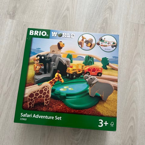 BRIO togbane junglesæt med rundt træsport, grøn base med træ, lille lokomotiv med vogn, jungelfigur, abe og zebra. Sættet består af buede skinner, der danner en cirkel, samt tilbehør til rolleleg i et junglemiljø. Passer sammen med andre BRIO trætog og skinner i samme system.