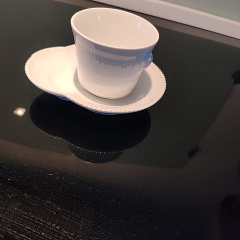 Royal Copenhagen espresso/moccakop med underkop i porcelæn. Orange glasur med guldfarvet kant og hank. Rummer 1 dl. Ingen skår. Pris pr. stk. 250kr. Samlet 6 kopper og 5 underkopper 1000kr