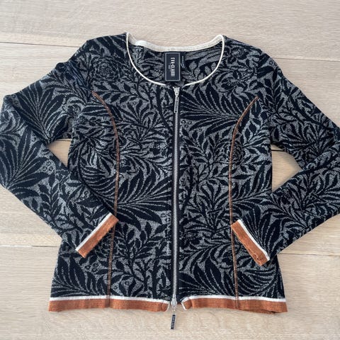 Lækker cardigan med lynlås og sjove detaljer fra Eva og Claudi i str M. sort mønstret med rød pyntekant.
